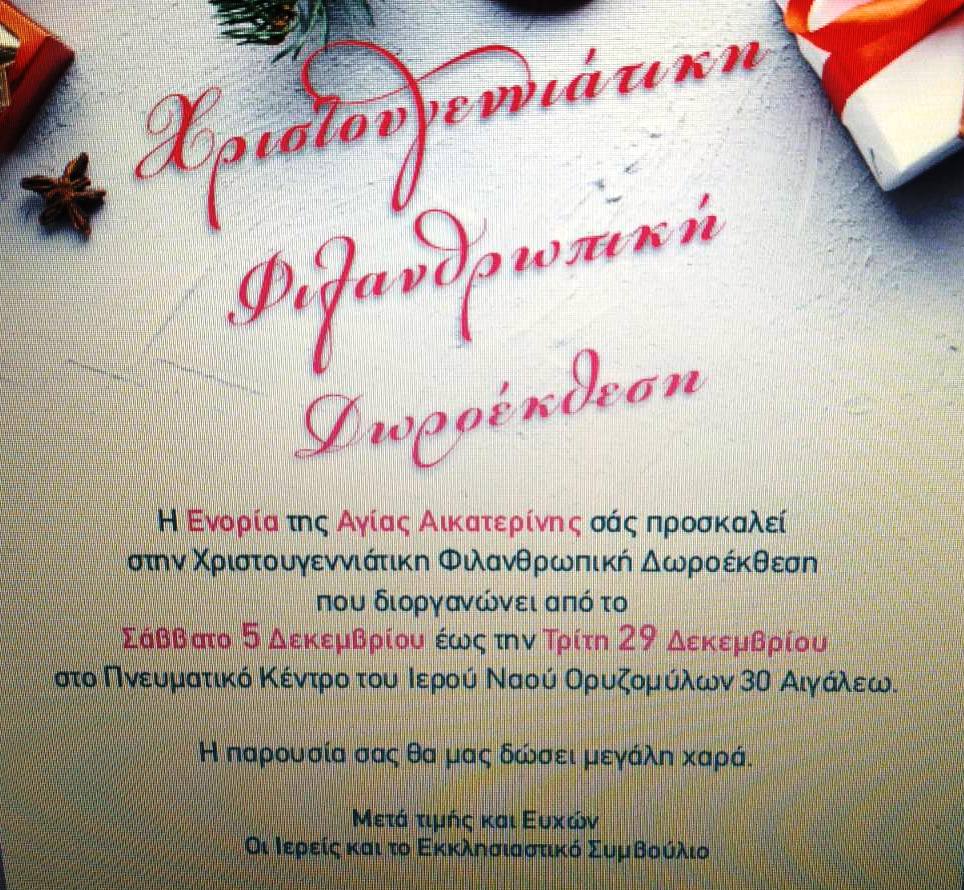 Η ενορία της Αγίας Αικατερίνης Αιγάλεω σας προσκαλεί με χαρά στη δεύτερη Χριστουγεννιάτικη Φιλανθρωπική Δωροέκθεση, που πραγματοποιείται και την φετινή χρονιά στον φιλόξενο χώρο του Πνευματικού Κέντρου (είσοδος από την οδό Ορυζομύλων).