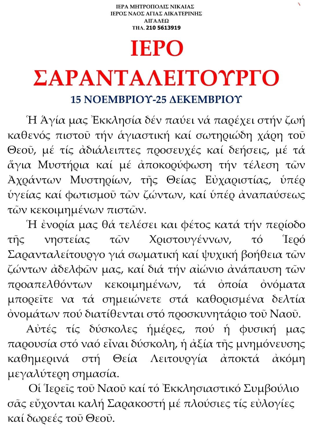 Ο Ιερός Ναός της Αγίας Αικατέρινης στο Αιγάλεω θα τελέσει και φέτος το Ιερό Σαρανταλείτουργο των Χριστουγέννων, από τις 15 Νοεμβρίου μέχρι και τις 25 Δεκεμβρίου, για την ψυχική βοήθεια όλων μας και για την αίωνια ανάπαυση των κεκοιμημένων αδελφών μας. Το Ιερό Σαρανταλείτουργο αποκτά- στην δύσκολη περίοδο που διανύουμε- πρόσθετη σημασία, έτσι ώστε να αποφευχθεί ο συνωστισμός των πιστών, καθώς Θεία λειτουργία θα επιτελείται κάθε μέρα στις αναφερόμενες ημερομηνίες. Σας ευχόμεθα ολόψυχα Καλή και Ευλογημένη Σαρακοστή!